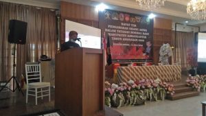 Kepala Badan Kesatuan Bangsa dan Politik Kabupaten Karanganyar memberikan sambutan pada kegiatan Rapat Tim Pengawasan Orang Asing dalam tatanan normal baru, Kamis 16 Juli 2020 di Jawa Dwipa Heritage Resort  and Convention Karangpandan