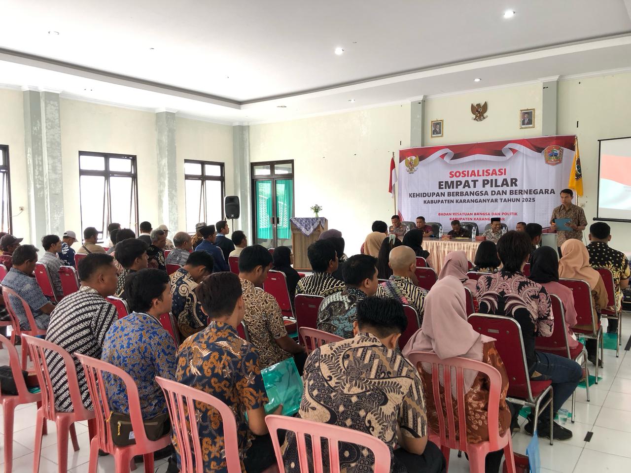 Pada Hari Selasa, 11 Februari 2025 di Kecamatan Karangpandan, Kabupaten Karanganyar telah dilaksanakan Sosialisasi Empat Pilar Kehidupan Berbangsa dan Bernegara memberikan pembelajaran lebih mengenai Pancasila, UUD 1945, Bhinneka Tunggal Ika dan NKRI, dilakukan guna meningkatkan kesadaran masyarakat tentang berkehidupan berbangsa dan bernegara bersama masyarakat khususnya di Kabupaten Karanganyar ini. Gotong-royong, toleransi, kerukunan dan hidup berdampingan merupakan nilai-nilai yang sejalan dengan Empat Pilar Kebangsaan.